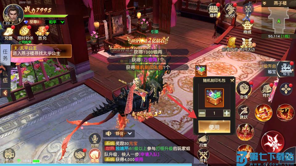 3、3段大少林轻功,乘龙驾鹤辗转挪移,多维度立体式战斗世界,数万人战斗热情开演,百套个性化服装,帅气灵兽座骑等着你搜集。