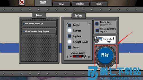 1、选择难度后点击红框标注的蓝色PLAY按钮,开始游戏。