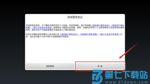 1、阅读游戏服务协议后,点击红框标注的同意按钮继续。