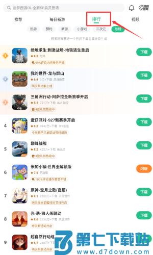2、在排行榜界面点击红框标注的下载按钮,安装游戏。