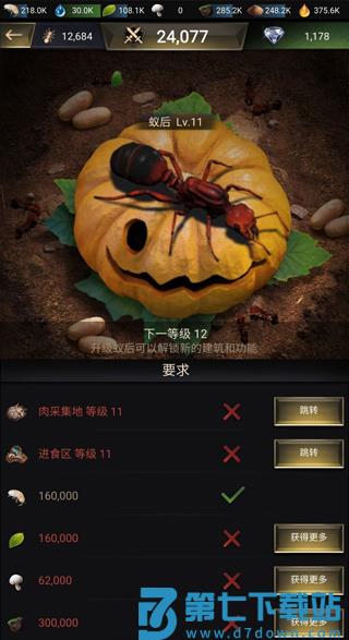 蚁巢地区限制条件:想要探索除去自己等级之外的更多蚁巢位置,就必须将蚁后的等级提升,而蚁后想要提升等级,就转化成了各种资源的获取以及仓库储存限制。这两个条件是相互转换的,说白了,想解锁更多的区域,你就得有这么多的物资。而新手引导结束之后,玩家们的主要目标也应该变成想法提高蚁后的等级,这样主要任务就转化成为尽可能多的在游戏中获取肉,水,植物,沙子,蜜露等种种资源。