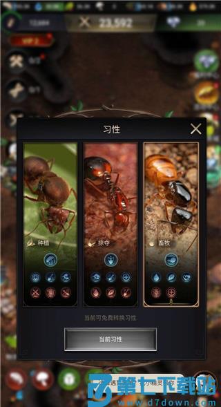 1、种植:游戏中玩家们达到七级之后,就可以进行一次习性自行选择,所选的习性将会影响今后的发展方向,三天之后可以免费更换一次,期间无法更换。种植这个习性是比较偏向于发展的,每次在晚上被偷袭的时候,可以保证资源有所保障,不被完全掠夺走,而且工蚁干活速度,采集速度以及负重都会额外增加一倍左右。当然也是有负面效果的,就是打仗用的军队兵蚁战斗力会大打折扣,防御力也会大打折扣。而且在战斗的时候,行军速度也会变慢,这是为了让各位玩家在前期快速发育时用的,前期玩家们一般都会有系统的新手保护,这个时候不用担心会被掠夺。