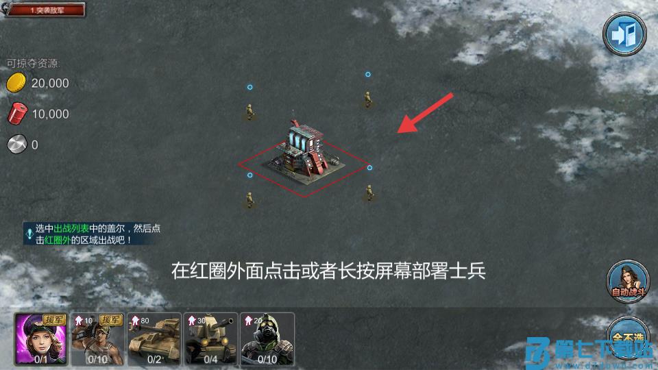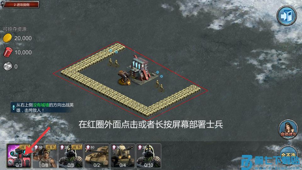 1、在红圈外面点击或者长按屏幕部署士兵。