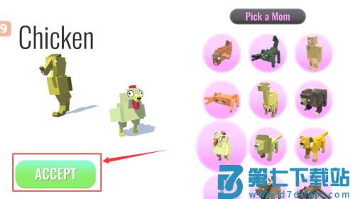2、点击红框标注的绿色ACCEPT按钮,确认选择小鸡角色。
