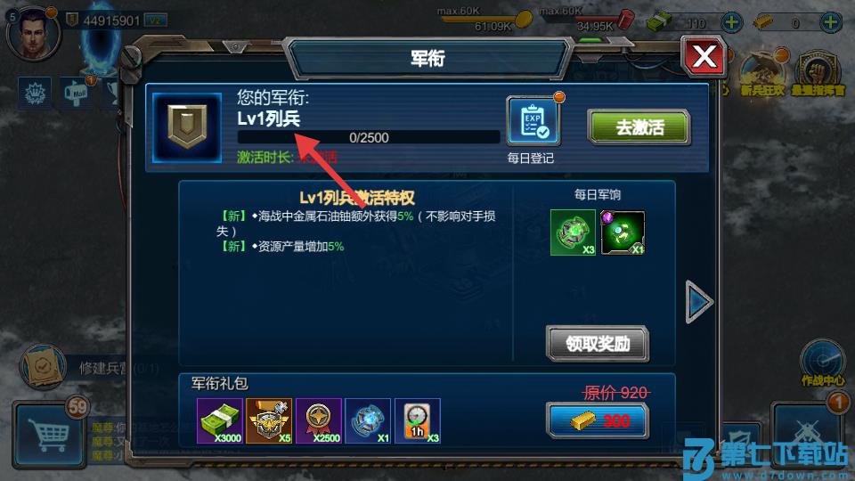 3、如图所示位置即可查看军衔等级。