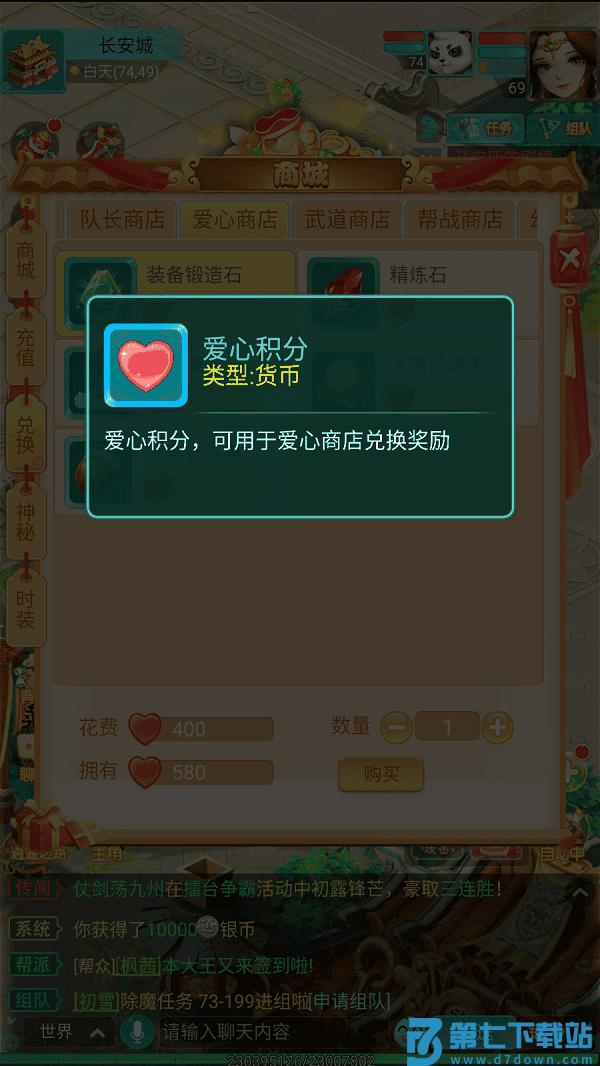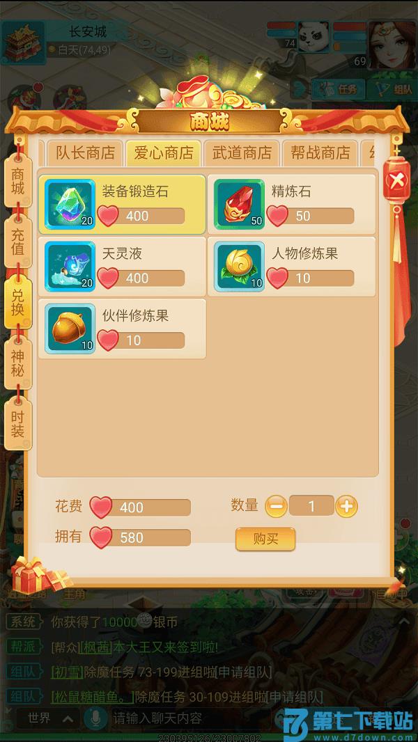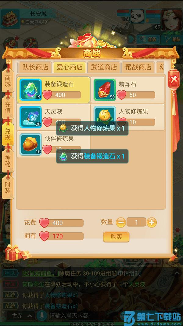 说了这么多爱心积分的来源,那么它到底能换些什么呢?这我们就要去爱心商店里看看了。爱心商店可以在商城的兑换里找到,在这里你可以兑换到锻造石、精炼石、天灵液和修炼果等实用道具。