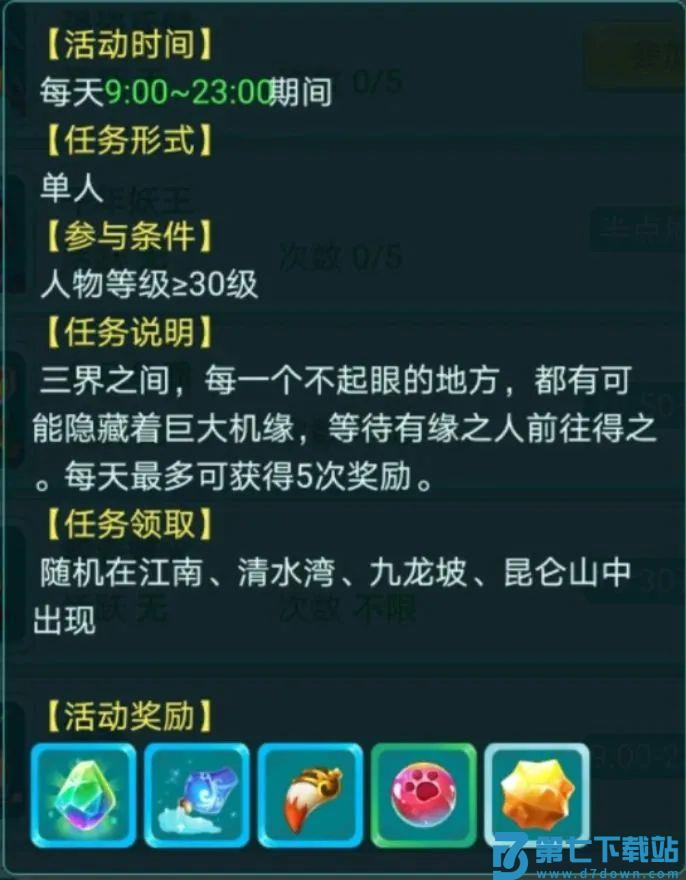 在三界每一个不起眼的地方,都可能藏着巨大的机缘,少侠遇见这些机缘千万不要放过,接取仙缘并完成,你也能获得大量的经验,每天可接取5次仙缘