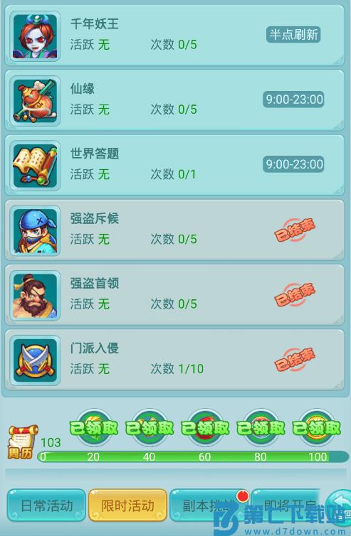 还有一些限时任务,比如“强盗首领”、“强盗斥候”、“门派入侵”“幻境寻宝”等,早间或晚间活动也要参加哦