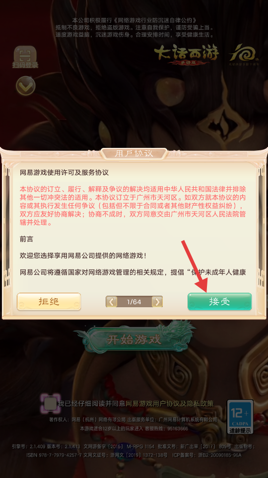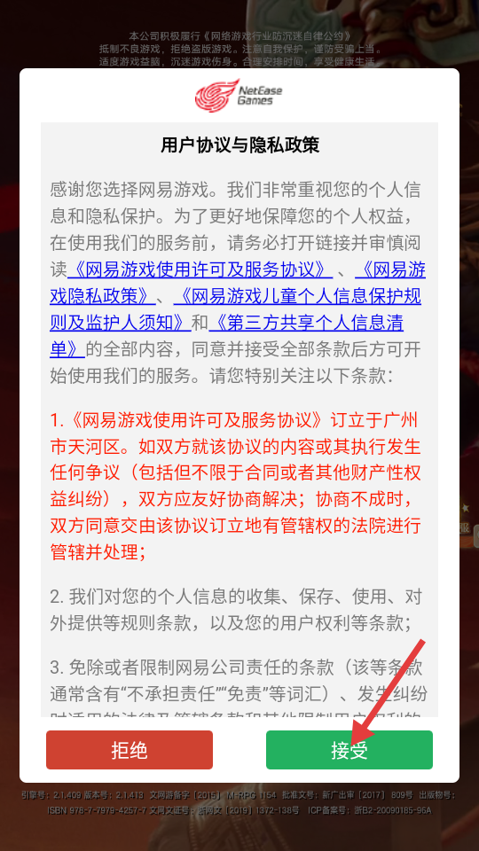 1、打开游戏点击接受。