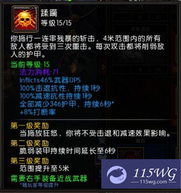 技能效果:这是近战狂战士的主要输出技能,通过三次重击对敌人造成极高的伤害。每次攻击至少能够造成46%的武器伤害。
